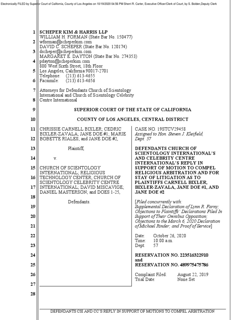 CHRISSIE CARNELL BIXLER; CEDRIC BIXLER-ZAVALA; JANE DOE #1; MARIE BOBETTE RIALES; and JANE DOE #2, Plaintiff, v. CHURCH OF SCIENTOLOGY INTERNATIONAL; RELIGIOUS TECHNOLOGY CENTER; CHURCH OF SCIENTOLOGY CELEBRITY CENTRE INTERNATIONAL; DAVID MISCAVIGE; DANIEL MASTERSON; and DOES 1-25, Defendants. CASE NO. 19STCV29458
