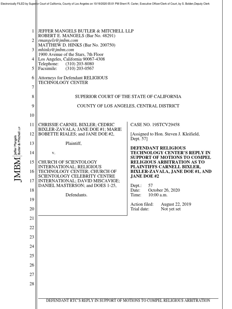 1900 Avenue of the Stars, 7th Floor Los Angeles, California 90067-4308 Telephone: (310) 203-8080 Facsimile: (310) 203-0567 Attorneys for Defendant RELIGIOUS TECHNOLOGY CENTER SUPERIOR COURT OF THE STATE OF CALIFORNIA COUNTY OF LOS ANGELES, CENTRAL DISTRICT CHRISSIE CARNEL BIXLER; CEDRIC BIXLER-ZAVALA; JANE DOE #1; MARIE BOBETTE RIALES; and JANE DOE #2, Plaintiff, v. CHURCH OF SCIENTOLOGY INTERNATIONAL; RELIGIOUS TECHNOLOGY CENTER; CHURCH OF SCIENTOLOGY CELEBRITY CENTRE INTERNATIONAL; DAVID MISCAVIGE; DANIEL MASTERSON; and DOES 1-25, Defendants. CASE NO. 19STCV29458 [Assigned to Hon. Steven J. Kleifield, Dept. 57]