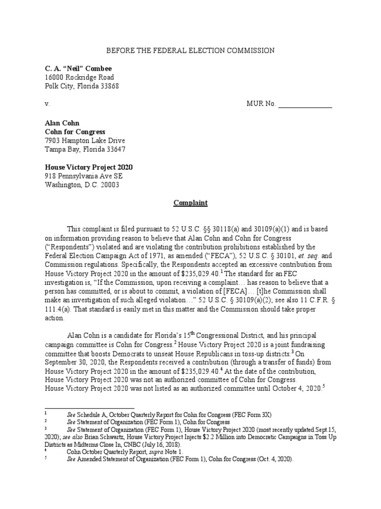 FEC Complaint Cohn and House Victory Committee by Neil Combee PDF