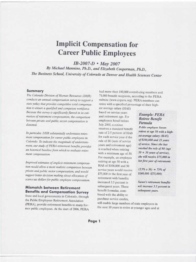 Implicit Compensation for Career Public Employees IB-2007-D * May 2007 By Michael Mannino, Ph.D., and Elizabeth Cooperman, Ph.D., The Business School, University of Colorado at Denver and Health Sciences Center Summary The Colorado Division of Human Resources (DHR) conducts an annual compensation survey to support a state policy that provides competitive total compensa- tion 0 ensure a qualified and competent workforce. Because this survey is significantly lawed in is esti- ‘maticn of retirement compensation, the comparison between private and public sector compensation is distoned. In pamticular, DER substanuially understates retire- ‘ment compensation for career public employees in Colorsdo, To indicate the magnitude of understate ‘ment, our study of PERA retirement benefits provides 4n historical baseline from which to evaluate retire- ‘ment compensation. Improved estimates of implicit retirement compensa ‘ion would allow a more realistic comparison between private and public sector compensation, and would ‘support better decision making about allocation of scarce tax dollars for public employee compensation. Mismatch between Retirement Benefits and Compensation Survey State and local goveroment in Colorado, through the Public Employees Retirement Association (PERA), provide retirement benefits to many for- mer public employees, AL the start of 2006, PERA had more than 180,000 contributing members and 71,000 benefit recipients, according to the PERA. website (www.copera org). PERA members can retire with a specified percentage of their high- est average salary (HAS) based on service years and rerement age. For eaimple: PERA Retiree Benefit employes hired before yea July 2005, a retiree receives a standard benetit —Pblle employee Susan rate of 25 percent of HAS "#Hres at age 50 with a high- for each service year ifthe “1 verse Salary (HAS) 2 2f$100,000 and 25 years rule of 80 (sum of service years and retirement age) is reached when retiring asec. Since she has reached the ral of 80 (age with aminimum age of 90, 30+ 30 years of servic), Forexample,an employee wil eeive $75,000 in retiring at age 50 with a her first year of retirement: HAS of $100,000 and 30 service years would receive (25% x 30) = 75% of $75,000 in the first year of $100,000 ($75,000) retirement with benefits increased 3,5 percent in Susan's retirement Benefits subsequent years. These will increase 3.5 percent in benefit formulas, com: subsequent years, bined with the ability to purchase service credits, will enable large numbers of state employees in the next 10 years to retire at younger ages and at Page 1higher benefit levels than comparable private sector employees. {In a somewhat surprising contrast, the 2007 2008, Annual Compensation Survey conducted by the Colorado Division of Human Resources (DHR) finds approximate parity between retirement com- pensation in the public and private sectors. For the private sector, retirement compensation is estimated a8 11.35 percent (7.65 percent FICA and an aver ‘age 42 percent to defined contribution plans) while ‘employer PERA contributions average 11.35 per- cent. ‘The reality seems far different from DAR's assess- ‘ment, Most private sector employees retire at sub> stantially older ages. Most of their retirement assets fare subject to market risks supplemented by modest social security income at the whim of political pres- sure w lower benefits, With a strong economy and the looming retirement cof many public employees, pressure is growing to raise compensation for state and local govern- ‘ment workers in Colorado. The Colorado Association of Public The Colorado Employees is correct that the Association of Public compensation system is flawed, Employees correct but their remedy to fix the eom- ‘that the compensa- pensation system is not. Their tion system is flawed, recommendation to concentrate ‘but their remedy to increased compensation on ‘fix the compensation long-term employees ignores the system is not, importance of deferted retirement compensation already available to retain long-term employees. ‘The flaw is due to the large amount of unmeasured {implici) deferred compensation in retirement beneiits for career employees. The large amount of doferred compensation encourages employees to retire in periods of peak productivity and limits bud~ ‘gets in areas of strong competition with the private secto: An important step in rationalizing compensation is a mpensation model that recognizes the large amount of deferred compensation earned by career employees. Increased compensation could be target- ed towards high priority areas, and career employees could be given the choice of immediate additional compensation or deferred compensation, Historical Compensation Value of PERA Retirement Benefits In response to these concerns, we performed a detailed study about lump-sum deferred compensae tion benefits under PERA. Specifically, our study. estimated the present value of expected retirement benefits using a sample of 278 universy retirees from 1999 ¢0 2006, wth salary histories from 1970 to 2006, In estimating the present value of future retirement benefits, we used the highest average salaries from ‘our sample, PERA mortality rates, and interest rates from the Single Premium Insurance Annuity (SPIA) marketplace. SPIA products provide the private sec tor allernative to achieve a guaranteed stream of lifetime income: We also created hypothetical retirement accounts for ceach retiree using PERA guaranteed rates and port- folie returns th estimate the retirement account bal- ‘ances if contributions (employee and employer) and earnings were accumulated until retirement, We refer to the difference between the purchase price ofa lifetime annu- ity from the SPLA market place Based on guaran- ‘teed PERA interest rates on account balances and inter- less the hypothetical retirement Salamis account balance, as implicit com." SF/A products inn