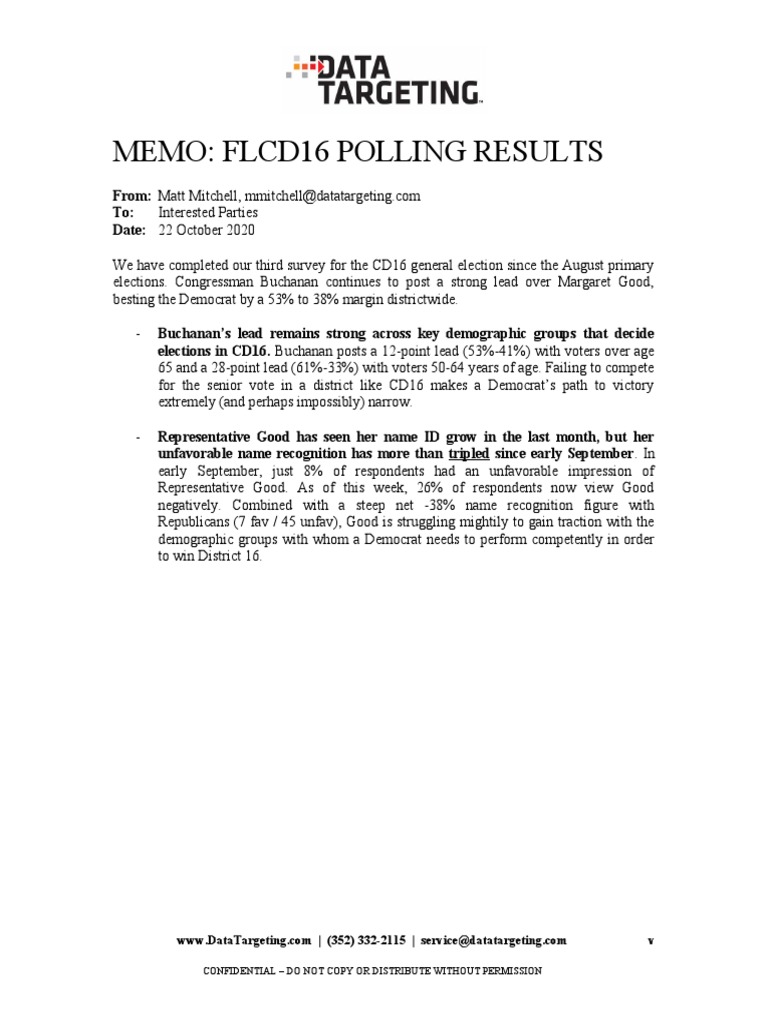 The survey shows that Congressman Buchanan continues to lead Democrat Margaret Good by 15% in Florida's 16th Congressional District. Buchanan has a strong lead among key demographic groups like voters over 65 and between 50-64. Good's name recognition has increased but her unfavorable ratings have more than tripled. The methodology describes a 400-voter survey of the district conducted between October 19-21 with a margin of error of +/- 4.9%.