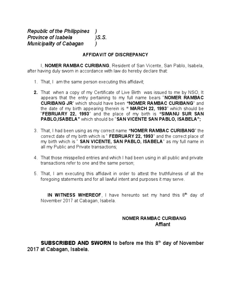 I, NOMER RAMBAC CURIBA, of legal age, and resident of San Vicente, San Pablo,