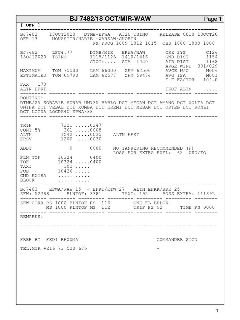 Flight Plan BJ7482: Monastir to Warsaw