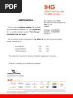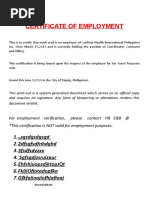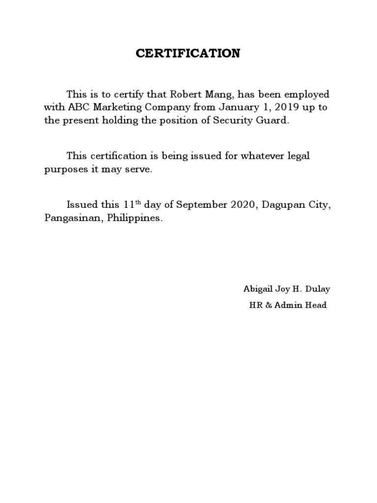 This certification confirms that Robert Mang has been employed as a Security Guard at ABC Marketing Company from January 1, 2019 to the present. It was issued on September 11, 2020 in Dagupan City, Pangasinan, Philippines for any legal purposes. The certification was signed by Abigail Joy H. Dulay, the HR & Admin Head of the company.
