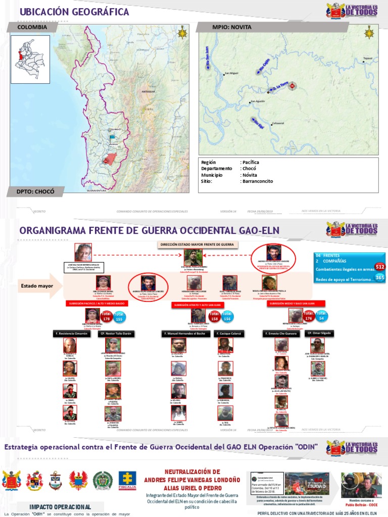 Este documento proporciona información sobre la estructura de mando del Frente de Guerra Occidental del Ejército de Liberación Nacional (ELN) en Colombia. Describe la jerarquía de líderes que dirigen cuatro frentes, dos compañías y 512 combatientes ilegales. El Frente de Guerra Occidental está dirigido por Andrés Felipe Vanegas Londoño y Oglí Ángel Padilla Romero como cabecilla principal.