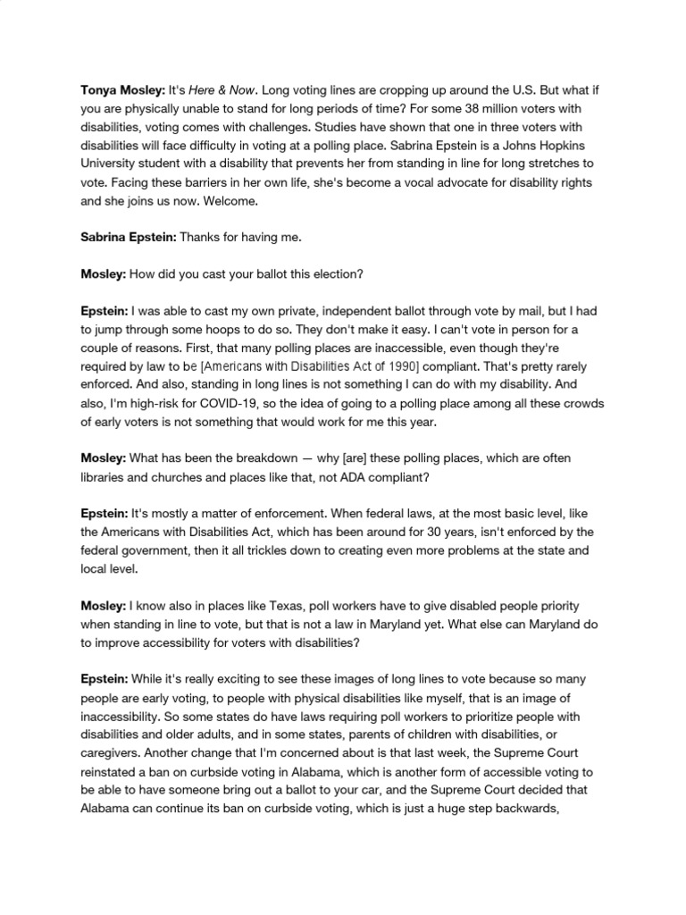 disabilities will face difficulty in voting at a polling place. Sabrina Epstein is a Johns Hopkins