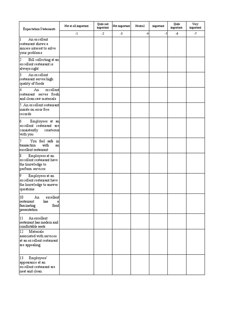 Service Expectation Standard Mean of