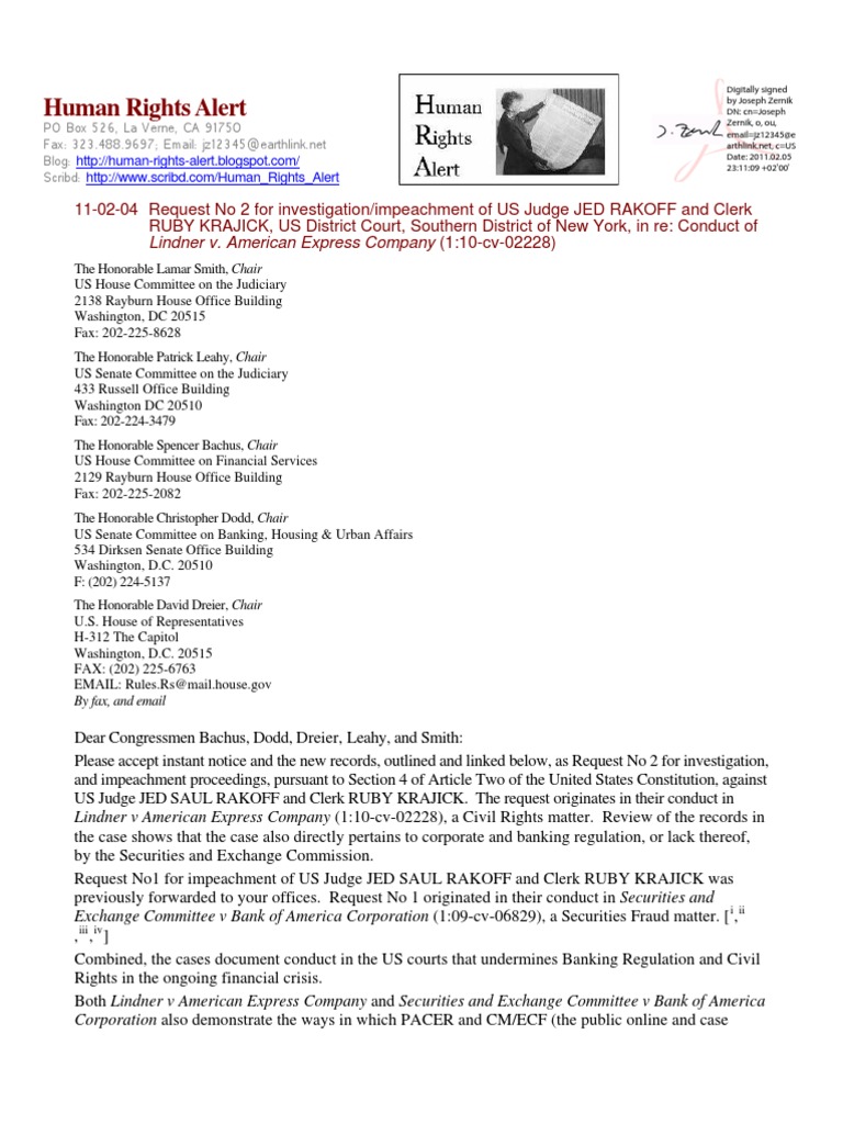 (1:10-cv-02228), a Civil Rights matter. Review of the records in the case shows that the case also directly pertains to corporate and banking regulation, or lack thereof, by the Securities and Exchange Commission. Request No1 for impeachment of US Judge JED SAUL RAKOFF and Clerk RUBY KRAJICK was previously forwarded to your offices. Request No 1 originated in their conduct in