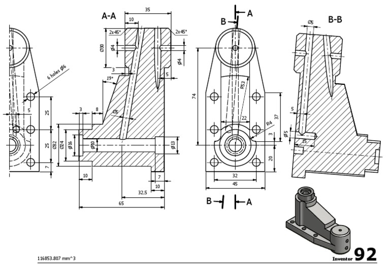 The document appears to be a technical drawing showing various measurements and dimensions. It includes labeled lines and angles indicating distances and specifications. Key details include measurements ranging from 2x45 to 116853.807 mm^3 and labels such as A-A, B-B, and Inventor 92.