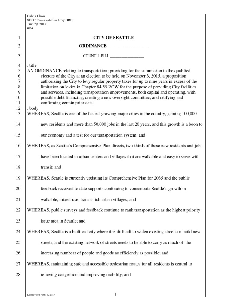 3 ..title 4 AN ORDINANCE relating to transportation; providing for the submission to the qualified 5 electors of the City at an election to be held on November 3, 2015, a proposition 6 authorizing the City to levy regular property taxes for up to nine years in excess of the 7 limitation on levies in Chapter 84.55 RCW for the purpose of providing City facilities 8 and services, including transportation improvements, both capital and operating, with 9 possible debt financing; creating a new oversight committee; and ratifying and 10 confirming certain prior acts. 11 ..body 12 WHEREAS, Seattle is one of the fastest-growing major cities in the country, gaining 100,000 13 new residents and more than 50,000 jobs in the last 20 years, and this growth is a boon to 14 our economy and a test for our transportation system; and 15 WHEREAS, as Seattle’s Comprehensive Plan directs, two-thirds of these new residents and jobs 16 have been located in urban centers and villages that are walkable and easy to serve with 17 transit; and 18 WHEREAS, Seattle is currently updating its Comprehensive Plan for 2035 and the public 19 feedback received to date supports continuing to concentrate Seattle’s growth in 20 walkable, mixed-use, transit-rich urban villages; and 21 WHEREAS, public surveys and feedback continue to rank transportation as the highest priority 22 issue area in Seattle; and 23 WHEREAS, Seattle is a built-out city where it is difficult to widen existing streets or build new 24 streets, and the existing network of streets needs to be able to carry as much of the 25 increasing numbers of people and goods as efficiently as possible; and 26 WHEREAS, maintaining safe and accessible pedestrian routes for all residents is central to 27 relieving congestion and improving mobility; and 28