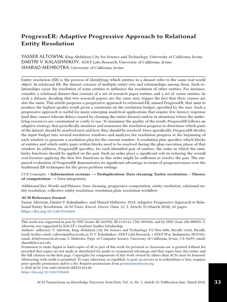 tional Entity Resolution. ACM Trans. Knowl. Discov. Data. 12, 3, Article 33 (March 2018), 45 pages.