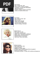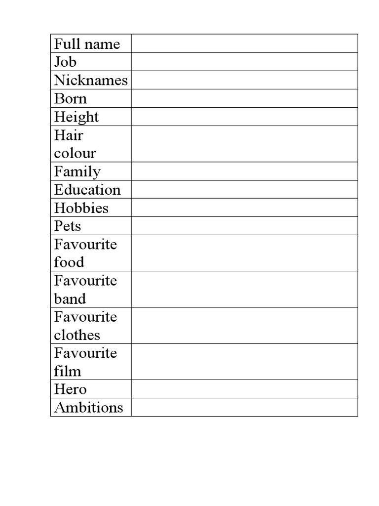 This document appears to be a profile template containing biographical information about an individual including their full name, job, basic physical description, family, education, interests and preferences. The template prompts for details in areas such as nicknames, date and place of birth, physical appearance, family background, educational history, hobbies, pets as well as favorite foods, music, films and clothing. It also asks who their hero is and what their ambitions are.