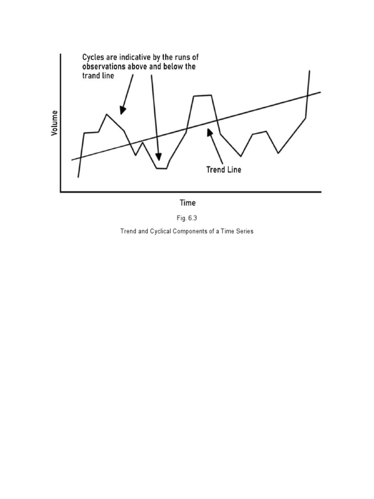 This figure shows a time series decomposed into trend, cyclical, and irregular components. The trend component shows the general upward or downward movement of the data over time. The cyclical component shows the recurring and periodic fluctuations around the trend. The irregular component represents the random fluctuations in the data after accounting for the trend and cyclical patterns.