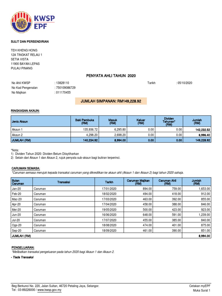 No Ahli KWSP : 13828110 Tarikh : 05/10/2020