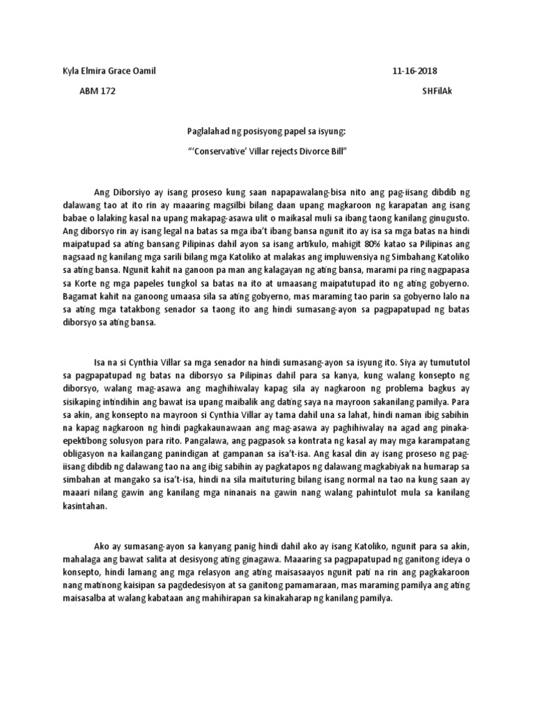 sa pagpapatupad ng batas na diborsyo sa Pilipinas dahil para sa kanya, kung walang konsepto ng