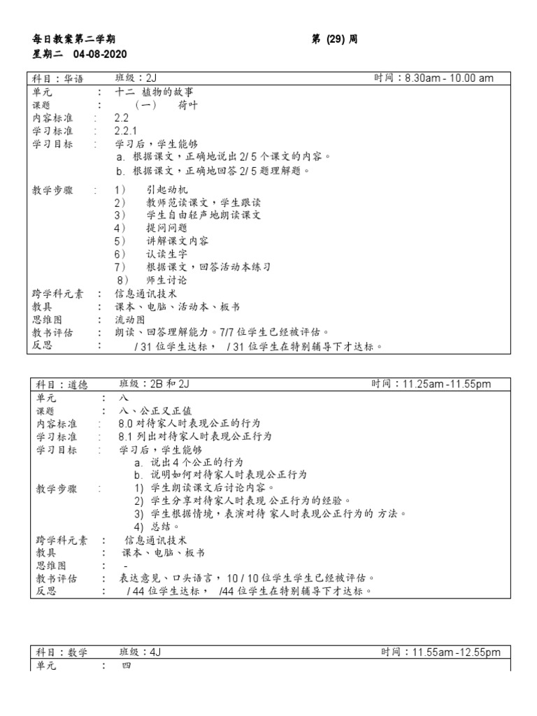 科目:华语 班级:2J 时间:7.30 am-8.30 am