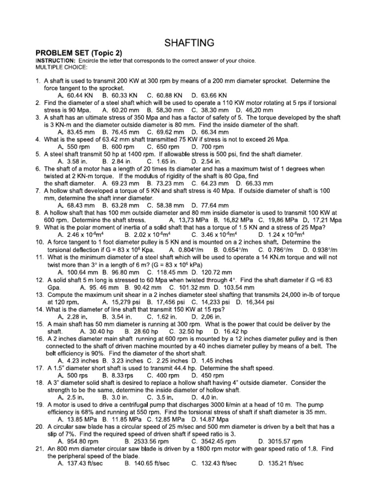 1. A shaft is used to transmit 200 KW at 300 rpm by means of a 200 mm diameter sprocket. Determine the