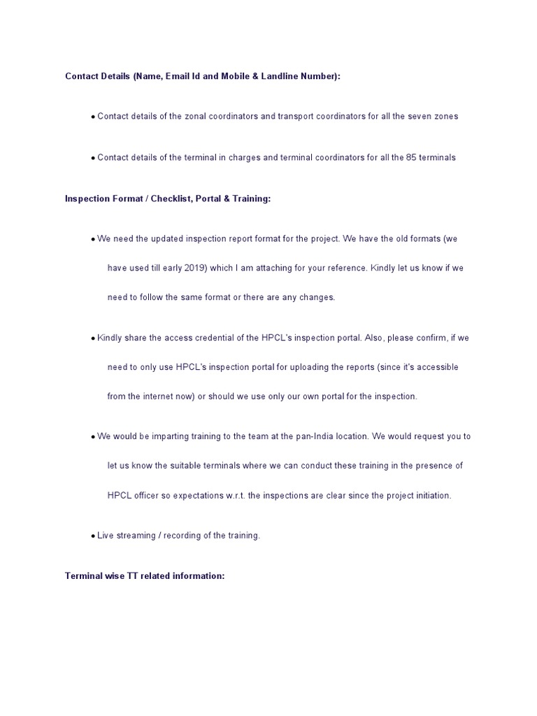 TTs of IOCL, BPCL, Reliance, Nayara, NRL etc.). Kindly confirm if any sort of inspection is