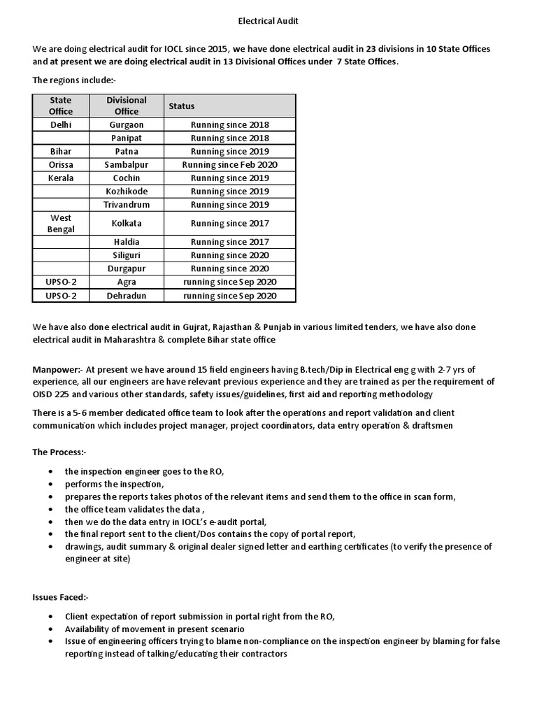 We are doing electrical audit for IOCL since 2015, we have done electrical audit in 23 divisions in 10 State Offices