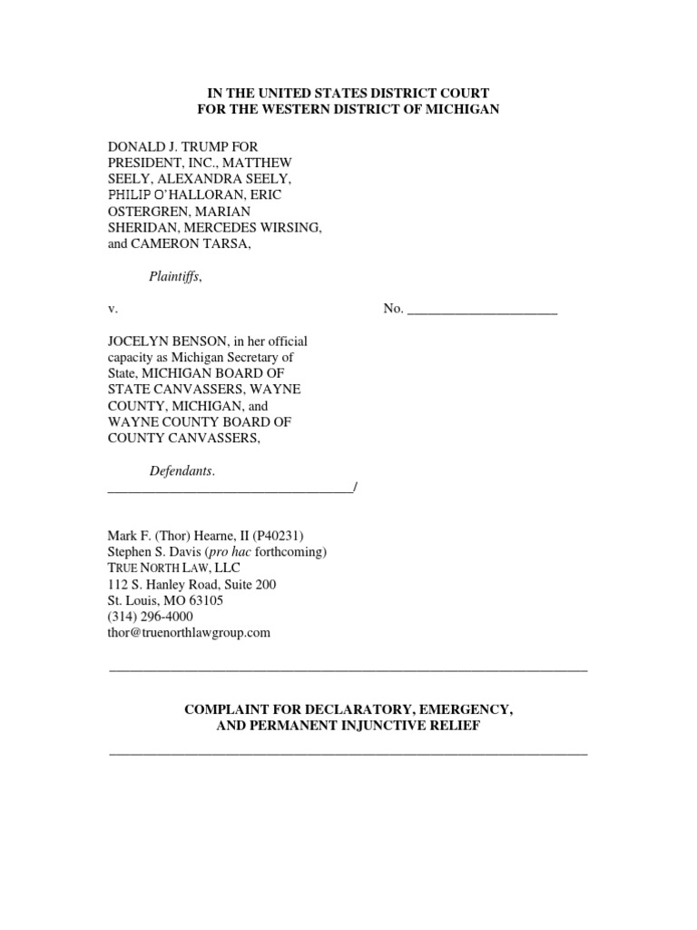 , v. JOCELYN BENSON, in her official capacity as Michigan Secretary of State, MICHIGAN BOARD OF STATE CANVASSERS, WAYNE COUNTY, MICHIGAN, and WAYNE COUNTY BOARD OF COUNTY CANVASSERS,