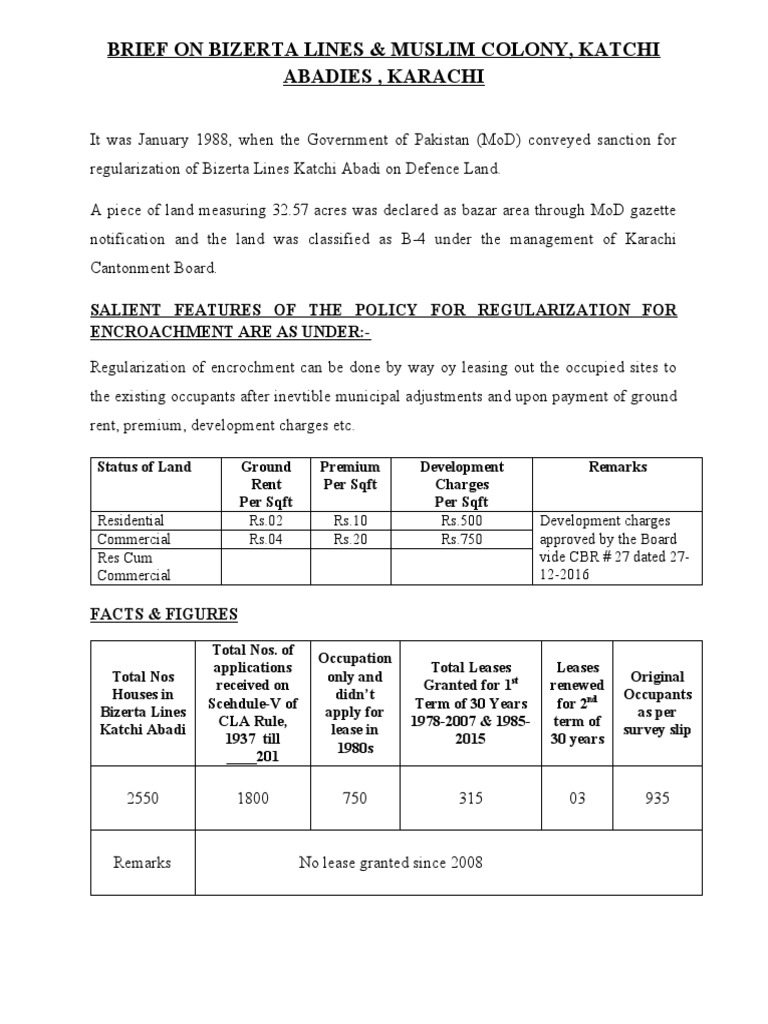 BRIEF ON BIZERTA LINES & MUSLIM COLONY, KATCHI