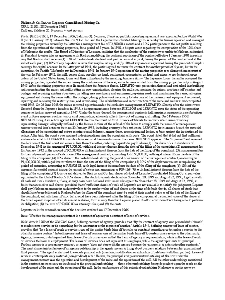 II (on 30 January 1937) between Nielson & Co. Inc. and the Lepanto Consolidated Mining Co. whereby the former operated and managed