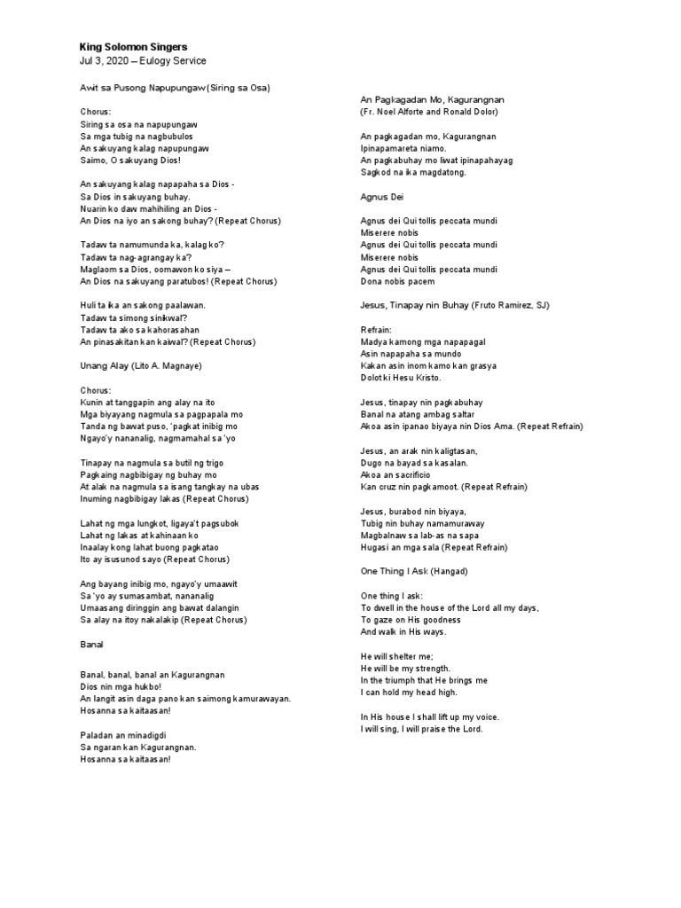 An Dios na iyo an sakong buhay? (Repeat Chorus) Agnus dei Qui tollis peccata mundi