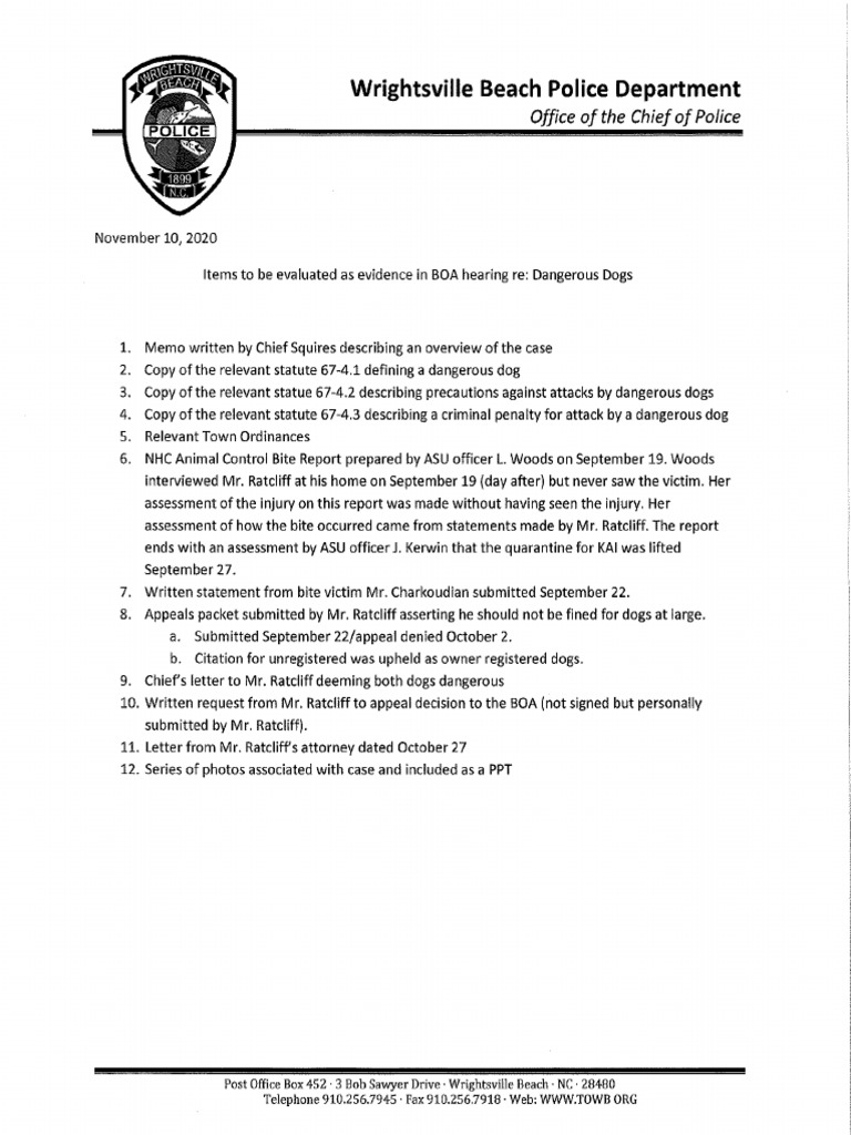 Items to be evaluated as evidence in BOA hearing re: Dangerous Dogs