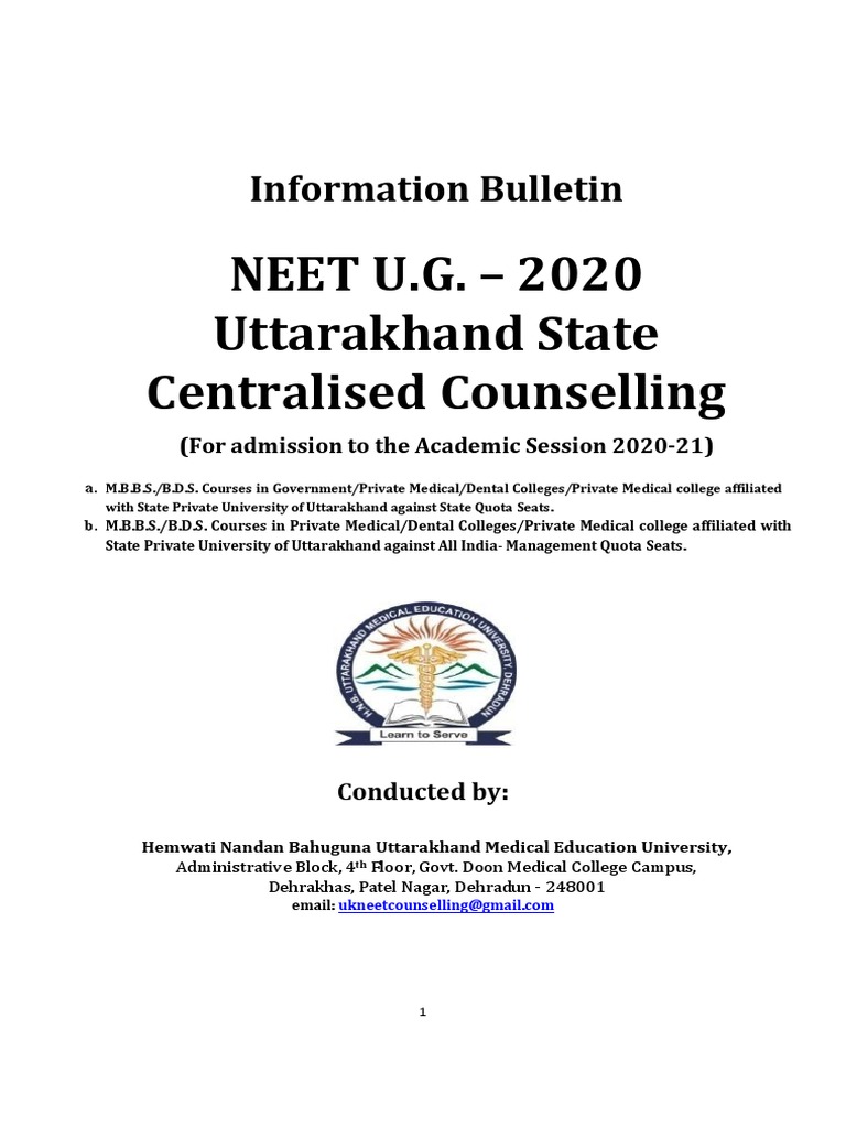 NEET U.G. - 2020 Uttarakhand State Centralised Counselling: Information Bulletin