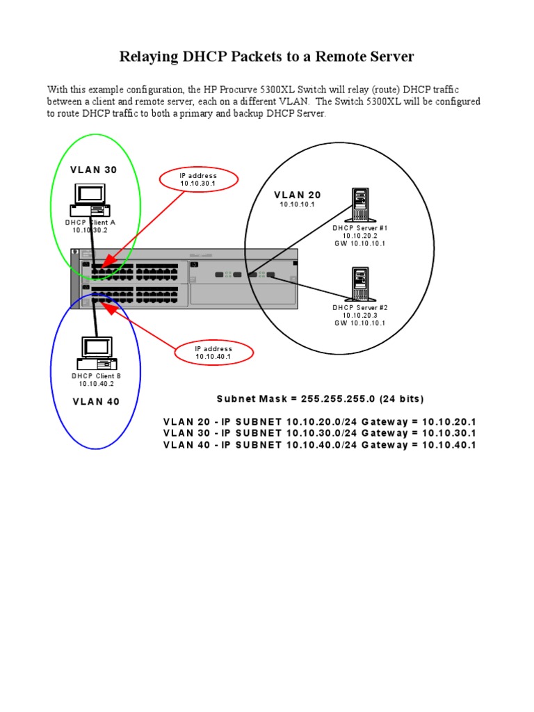 With this example configuration, the HP Procurve 5300XL Switch will relay (route) DHCP traffic