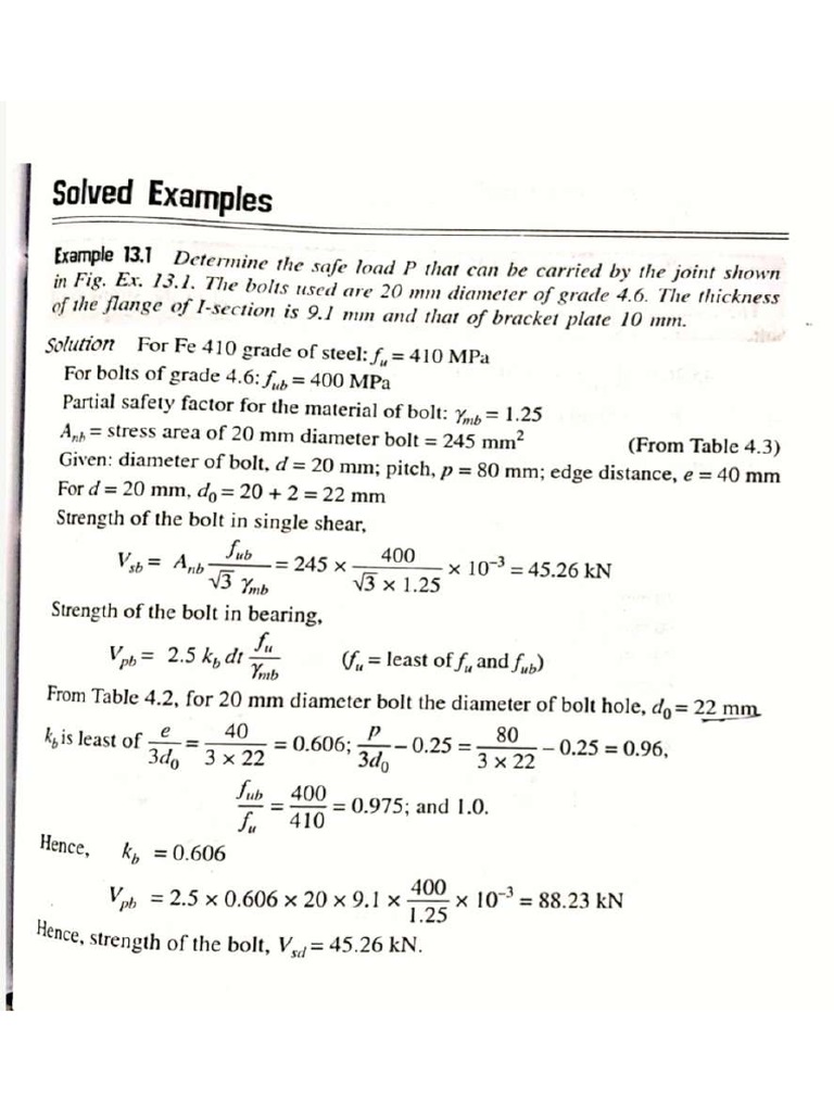 in Fig. Ex. 13.1. The bolts used are 20 mm diameter of grade 4.6. The thickness
