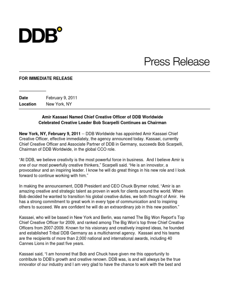 2 9 11_Amir Kassaei named Creative Leader_ Bob Scarpelli remains Chairman DDB WW