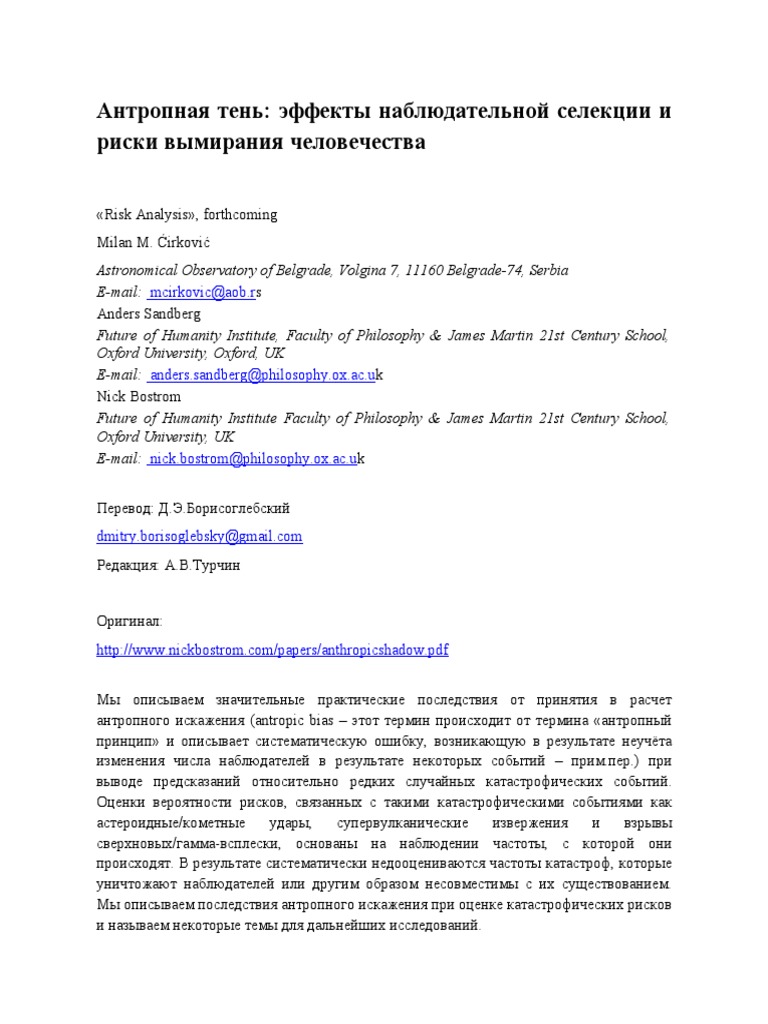 nick.bostrom@philosophy.ox.ac.uk : ..dmitry.borisoglebsky@gmail.com: ..:http://www.nickbostrom.com/papers/anthropicshadow.pdf (antropic bias ± «» , ± ..) . , / , /-, , . , . .