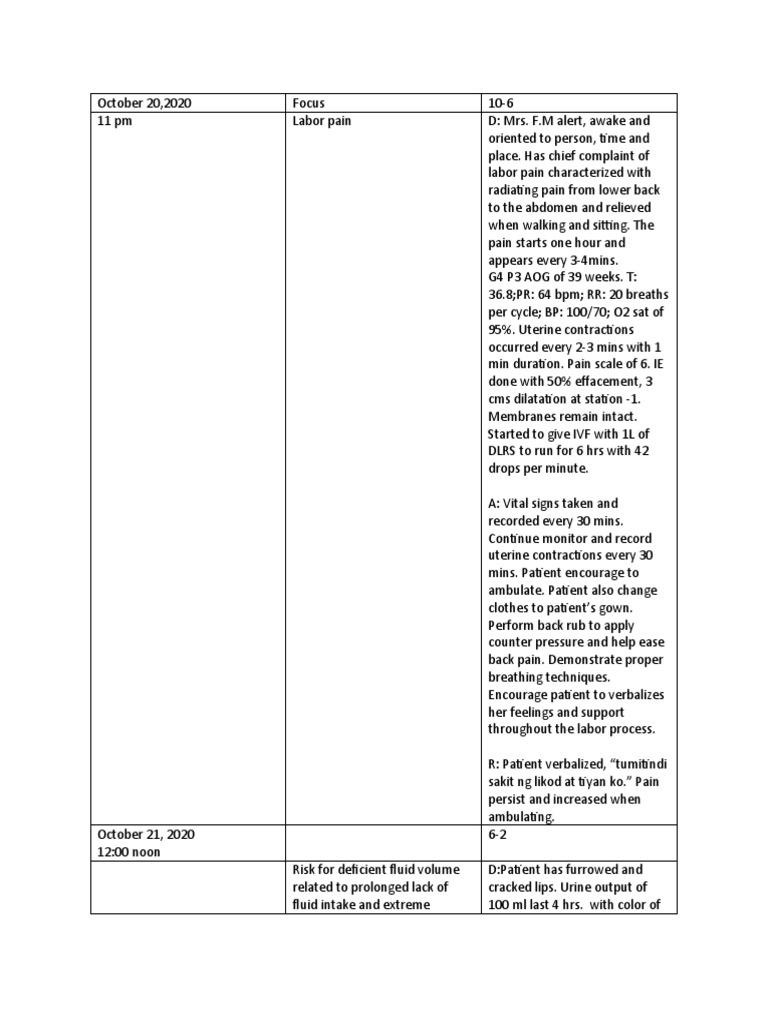 11 pm Labor pain D: Mrs. F.M alert, awake and