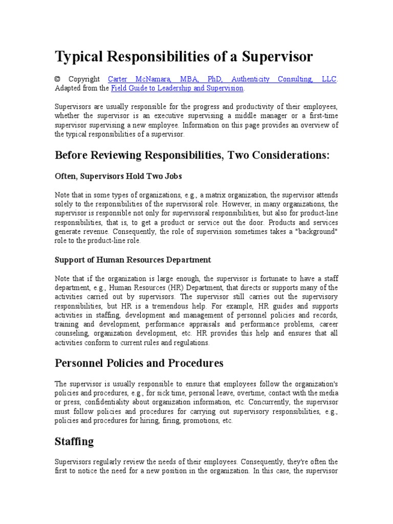 Typical Responsibilities of a Supervisor