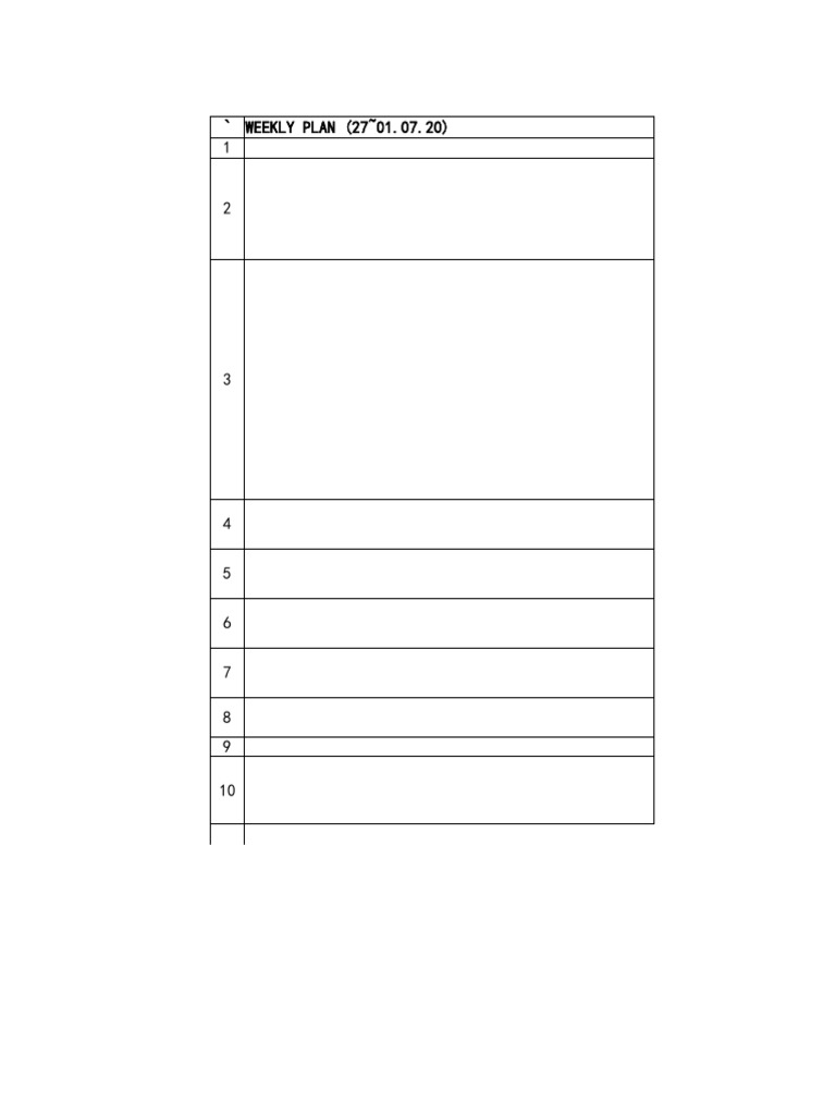 This weekly plan outlines 10 tasks to be completed: 1) Review last week's progress, 2) Meet with manager to discuss upcoming projects, 3) Work on report draft, 4) Attend team meeting, 5) Finish report draft, 6) Schedule client call, 7) Have client call, 8) Finalize report, 9) Submit report, 10) Prepare for next week.