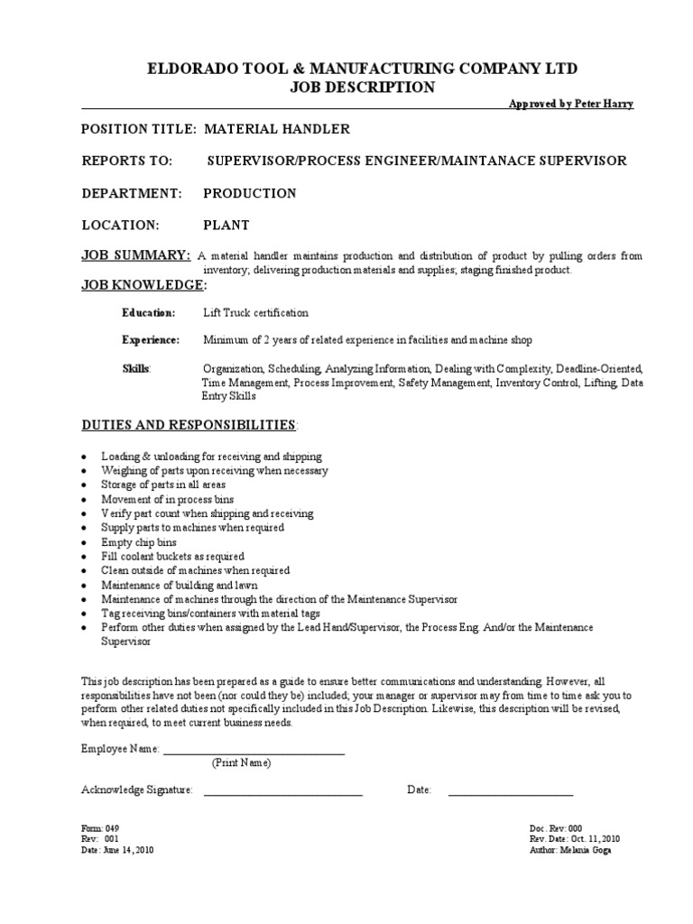 POSITION TITLE: MATERIAL HANDLER