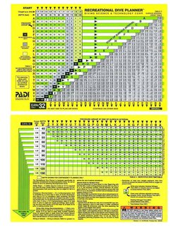 EANx32 Dive Planner: Provides a detailed chart for planning recreational dives using EANx32, indicating no-decompression limits and surface intervals.