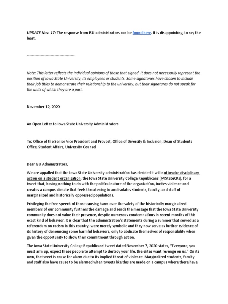 November 12, 2020An Open Leer to Iowa State University AdministratorsTo: Oce of the Senior Vice President and Provost, Oce of Diversity & Inclusion, Dean of Students Oce, Student Aairs, University Counsel Dear ISU Administrators, We are appalled that the Iowa State University administraon has decided it will not invoke disciplinary acon on a student organizaon, the Iowa State University College Republicans (@IStateCRs), for a tweet that, having nothing to do with the polical nature of the organizaon, incites violence and creates a campus climate that feels threatening to and isolates students, faculty, and sta of marginalized and historically oppressed populaons. Privileging the free speech of those causing harm over the safety of the historically marginalized members of our community furthers the damage and sends the message that the Iowa State University community does not value their presence, despite numerous condemnaons in recent months of this exact kind of behavior. It is clear that the administraon’s statements during a summer that served as a referendum on racism in this country, were merely symbolic and they now serve as further evidence of its history of denouncing some harmful behaviors, only to abdicate themselves of responsibility when given the opportunity to show their commitment through acon. The Iowa State University College Republicans’ tweet dated November 7, 2020 states, “Everyone, you must arm up, expect these people to aempt to destroy your life, the elites want revenge on us.” On its own, the tweet is cause for alarm due to its implied threat of violence. Marginalized students, faculty and sta also have cause to be alarmed when tweets like this are made on a campus where there have