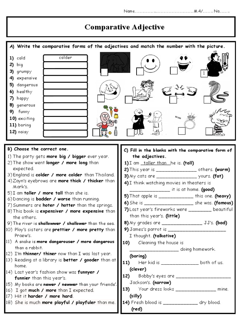 A) Write the comparative forms of the adjectives and match the number with the picture.