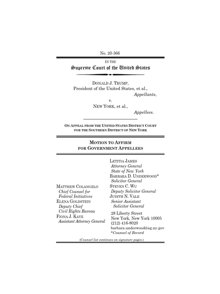 2. Whether the Memorandum’s direction to exclude undocumented immigrants who reside here from the apportionment base violates the Census Act. 3. Whether the Memorandum’s direction to base apportionment on figures other than the total-population count established by the decennial census violates the Census Act. 4. Whether the decision below may be affirmed on the alternative ground that the Memorandum’s direc-tives violate the Fourteenth Amendment and Article I of the United States Constitution.