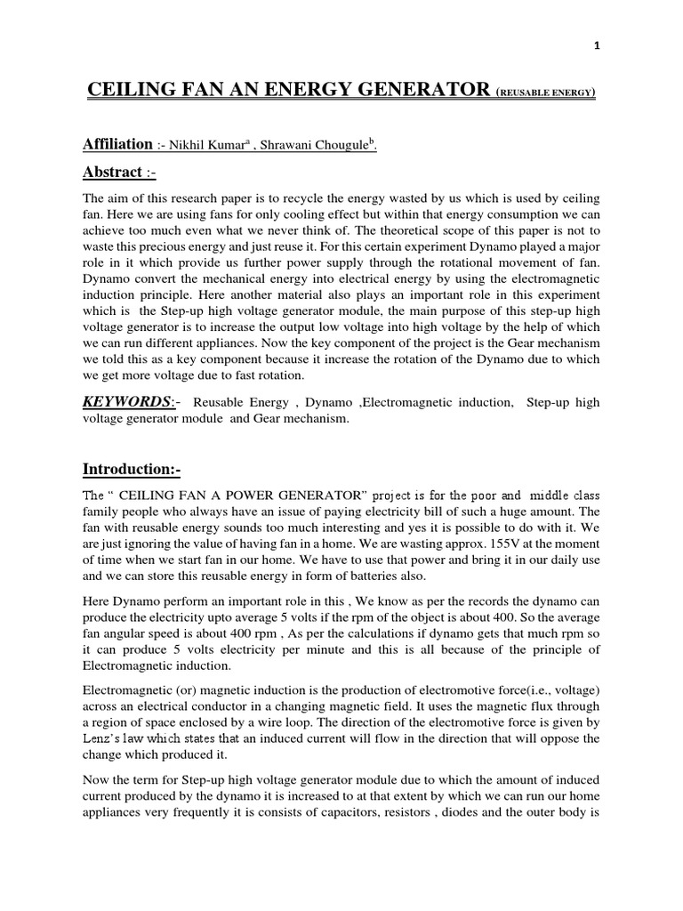 The “ CEILING FAN A POWER GENERATOR” project is for the poor and middle class