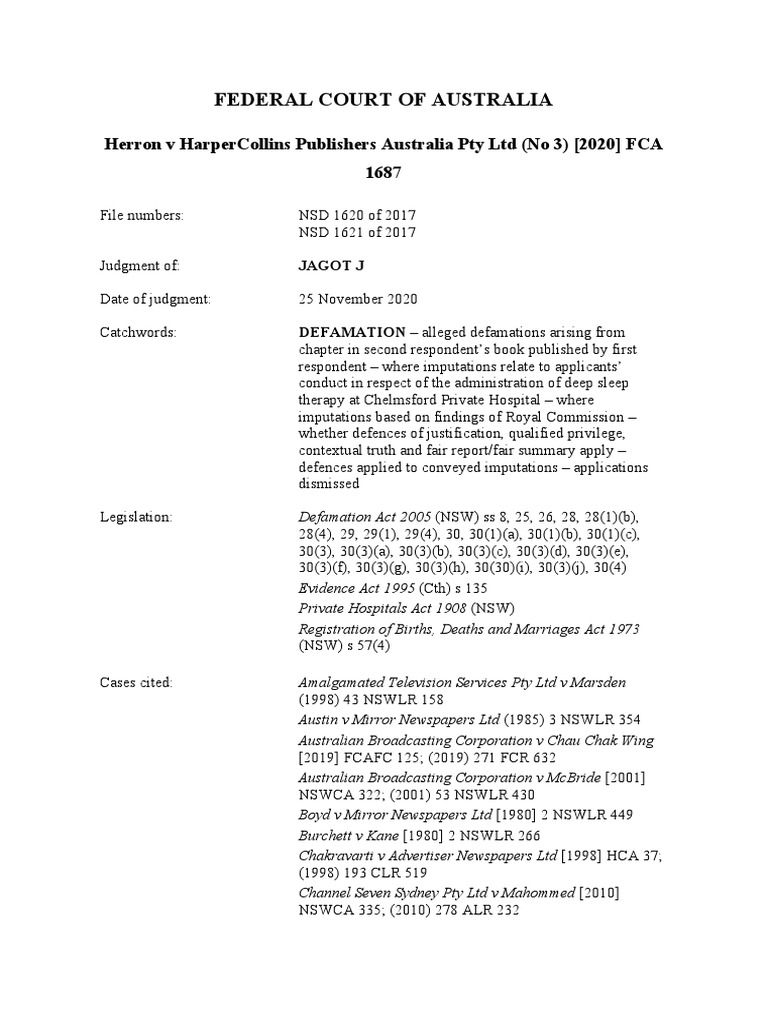Herron v HarperCollins Publishers Australia Pty Ltd (No 3) [2020] FCA 1687