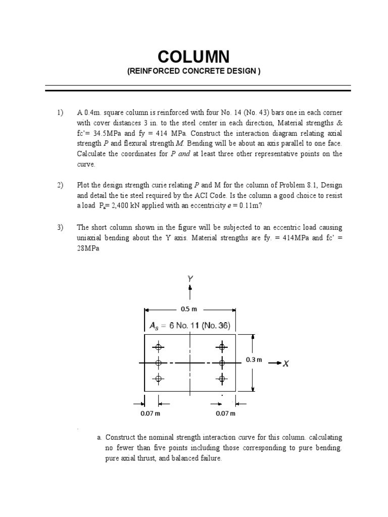 1) A 0.4m. square column is reinforced with four No. 14 (No. 43) bars one in each corner