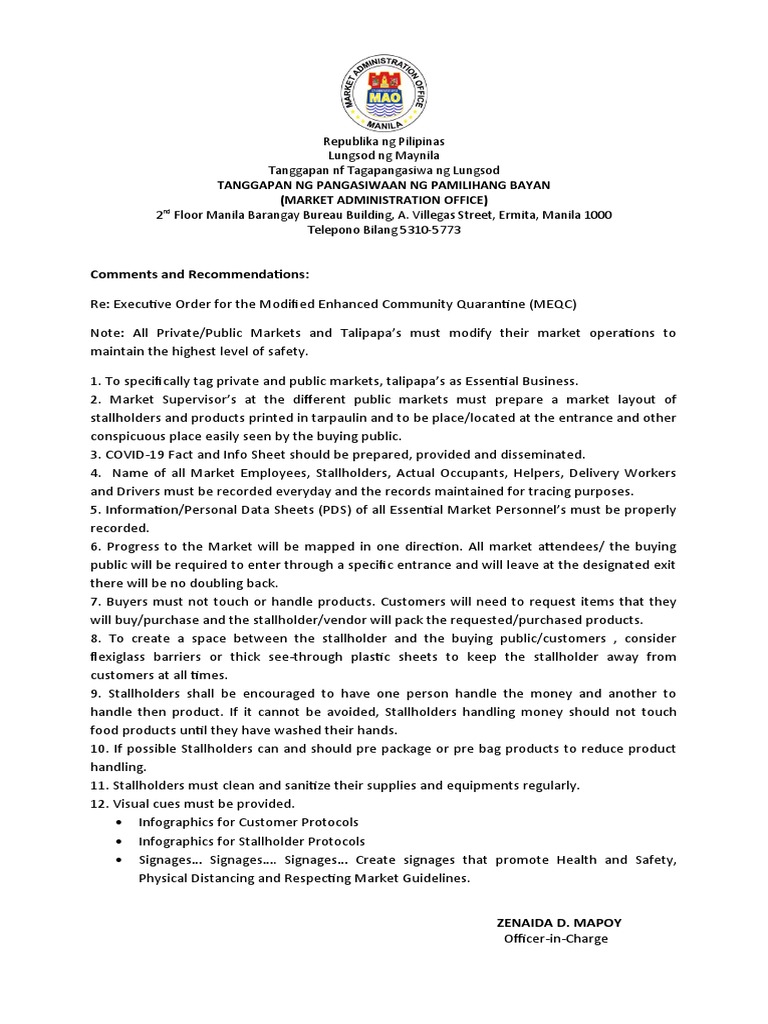 Note: All Private/Public Markets and Talipapa’s must modify their market operations to