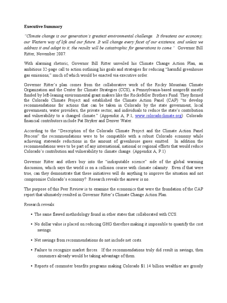 Governor Bill Ritter unveiled his Climate Change Action Plan in November 2007. The 32-page call to action outlining his goals and strategies for reducing 'harmIul greenhouse gas emissions' the recommendations were to be compatible with a robust Colorado economy. This Peer Review examines the economics that were the Ioundation oI the CAP report that ultimately resulted in Governor Ritter's plan.
