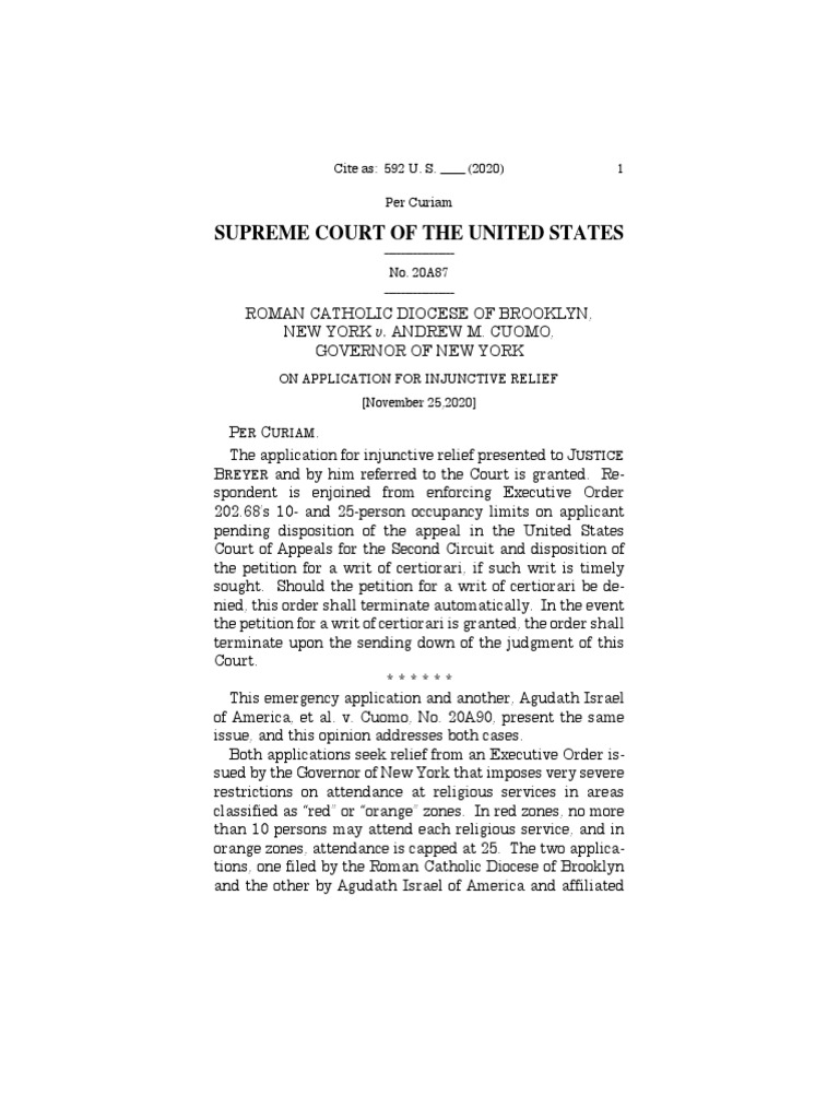 and by him referred to the Court is granted. Re-spondent is enjoined from enforcing Executive Order 202.68’s 10- and 25-person occupancy limits on applicant pending disposition of the appeal in the United States Court of Appeals for the Second Circuit and disposition of the petition for a writ of certiorari, if such writ is timely sought. Should the petition for a writ of certiorari be de-nied, this order shall terminate automatically. In the event the petition for a writ of certiorari is granted, the order shall terminate upon the sending down of the judgment of this Court. * * * * * * This emergency application and another, Agudath Israel of America, et al. v. Cuomo, No. 20A90, present the same issue, and this opinion addresses both cases. Both applications seek relief from an Executive Order is-sued by the Governor of New York that imposes very severe restrictions on attendance at religious services in areas classified as “red” or “orange” zones. In red zones, no more than 10 persons may attend each religious service, and in orange zones, attendance is capped at 25. The two applica-tions, one filed by the Roman Catholic Diocese of Brooklyn and the other by Agudath Israel of America and affiliated