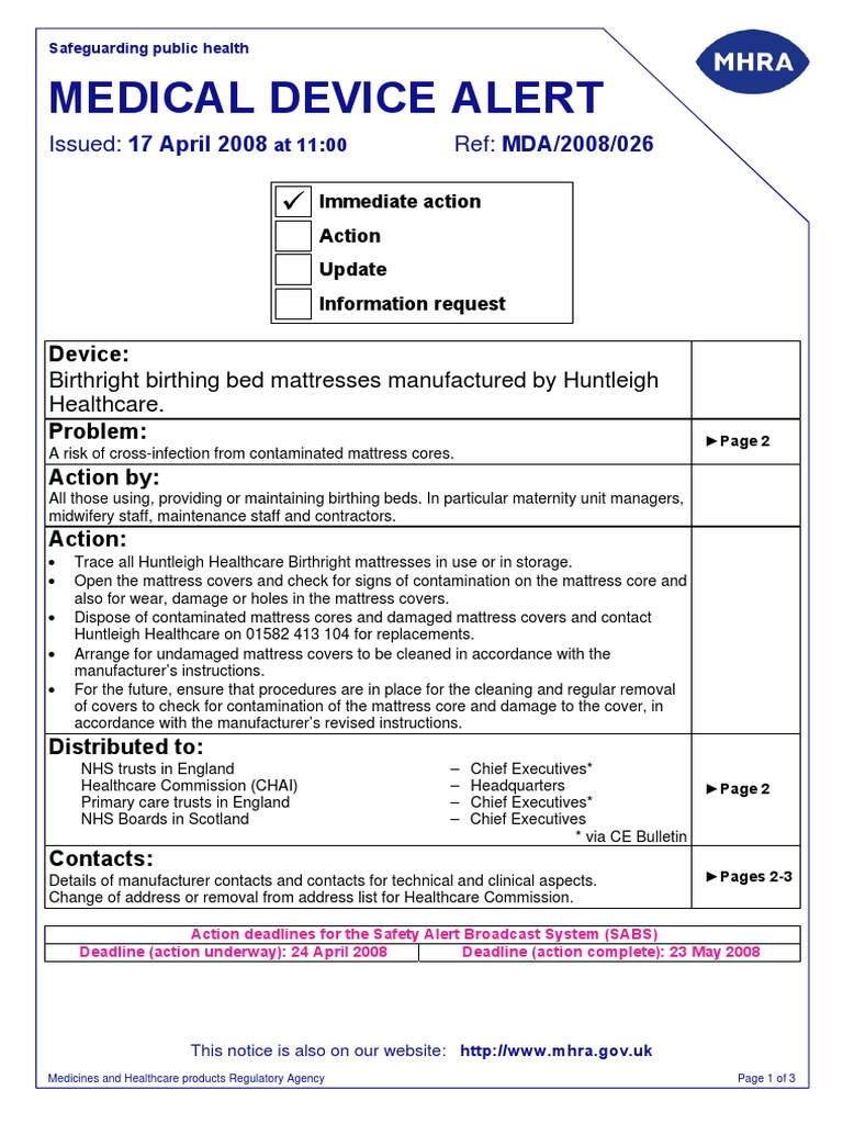 • Trace all Huntleigh Healthcare Birthright mattresses in use or in storage.