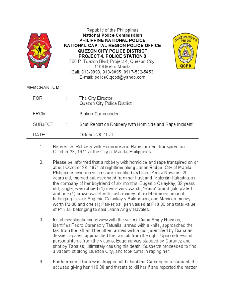 SUBJECT : Spot Report on Robbery with Homicide and Rape Incident