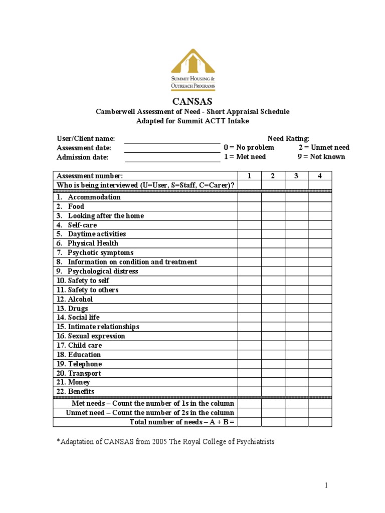 *Adaptation of CANSAS from 2005 The Royal College of Psychiatrists